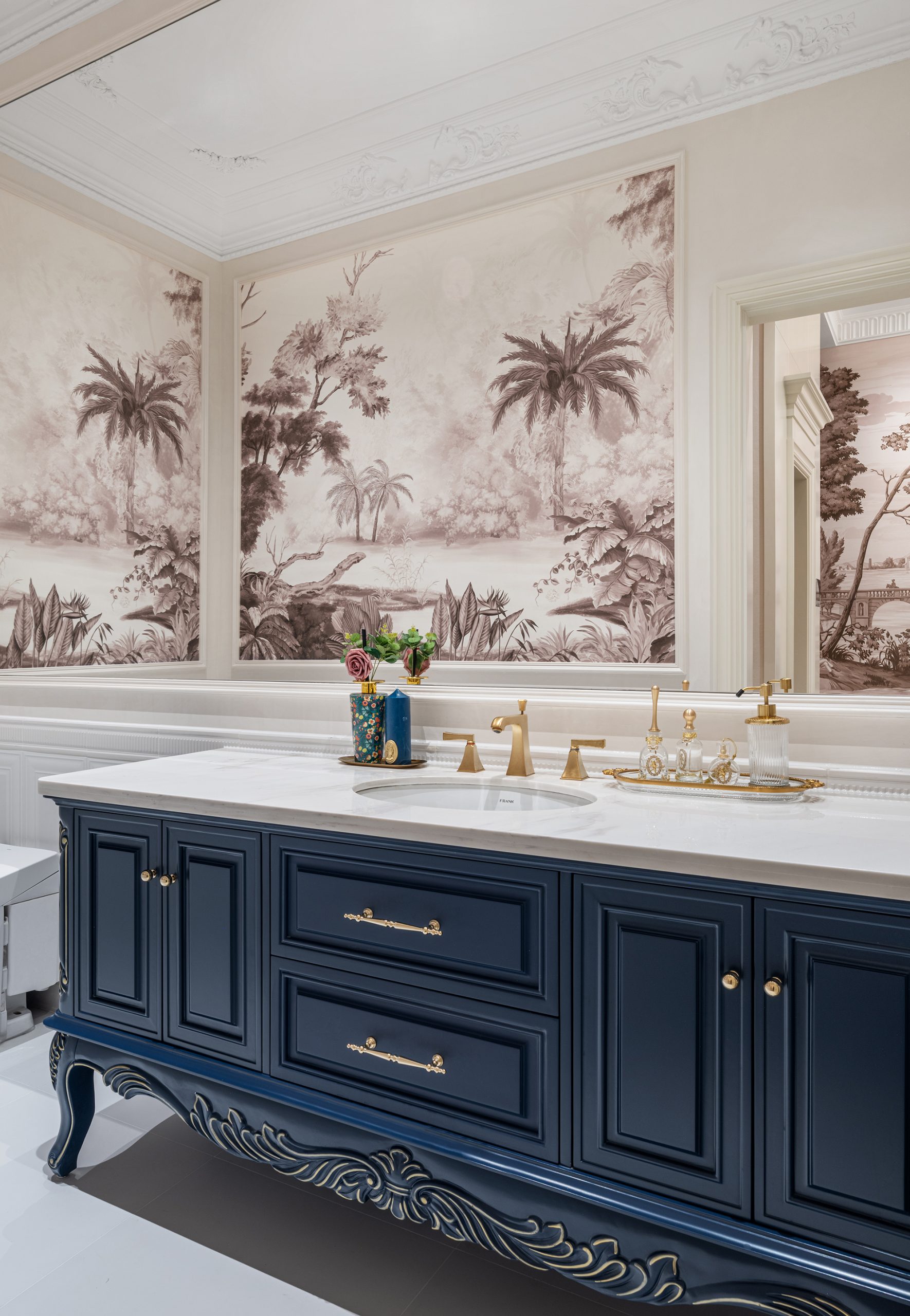 The guest bathroom continues the refined aesthetic through minimalist detailing. The vanity echoes the living room’s blue palette, while metallic accents introduce a subtle layer of brightness, maintaining continuity with the communal spaces.