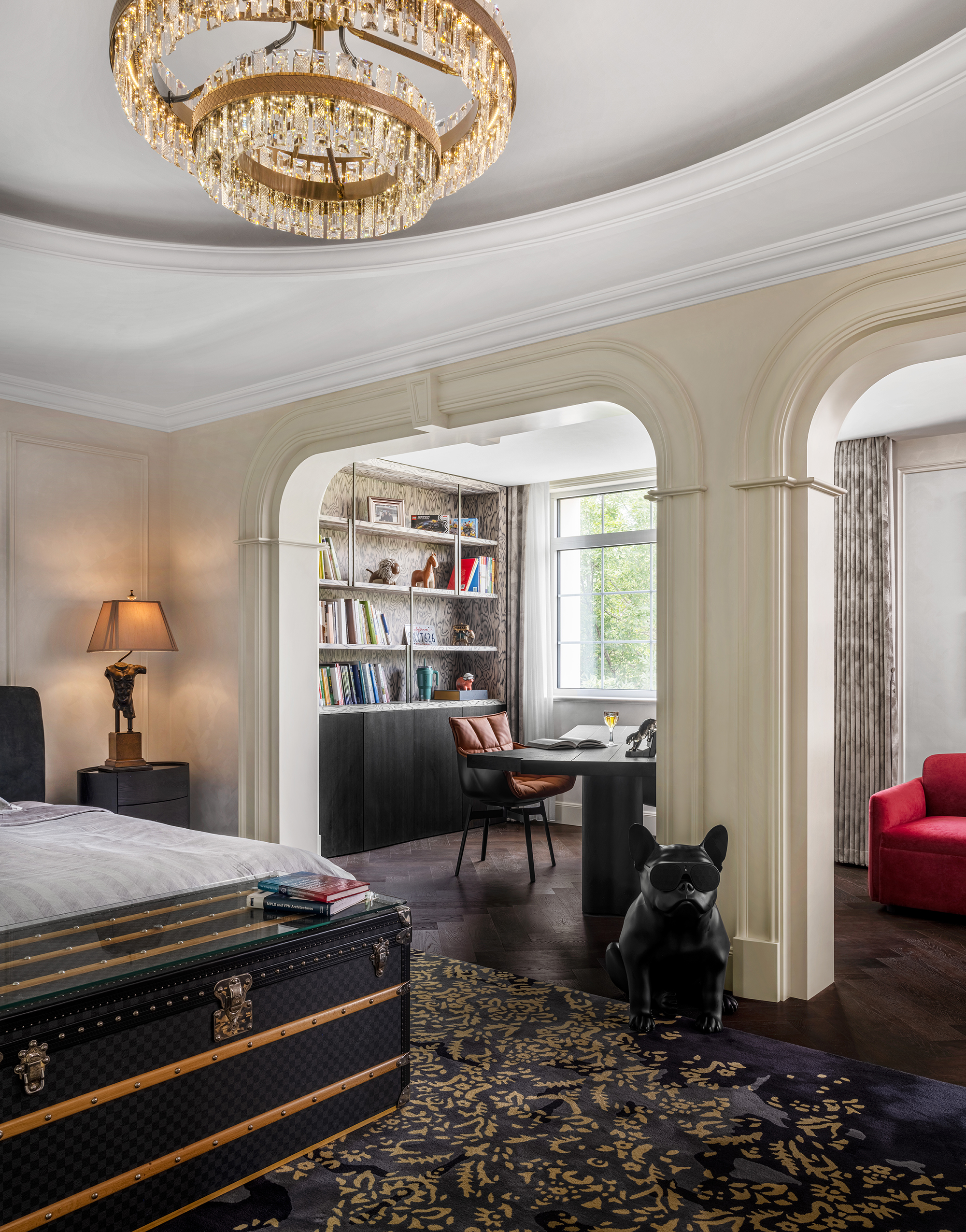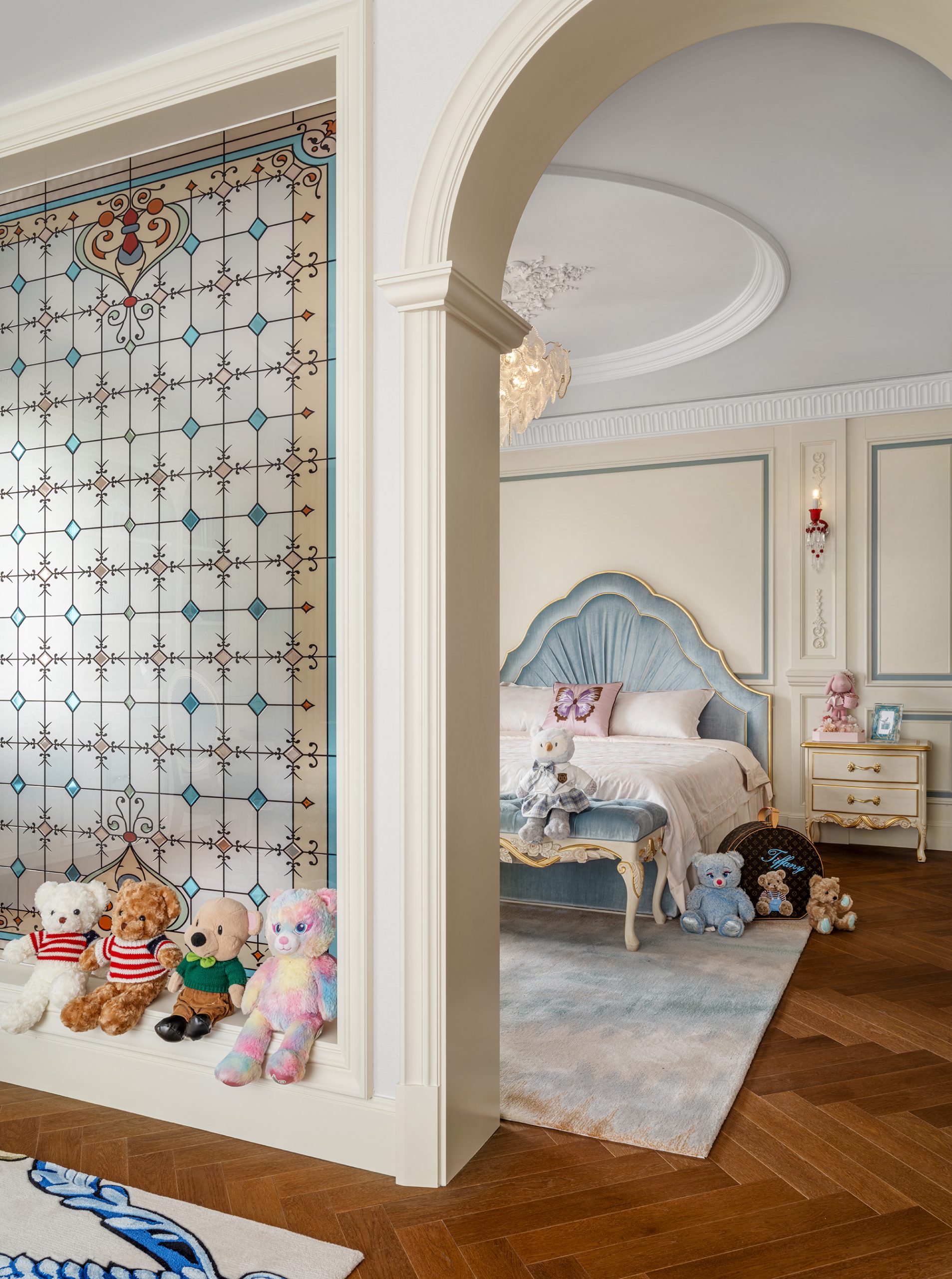 Located on the ground floor, the elders’ suite embraces a French Chinoiserie aesthetic. A balanced interplay between vibrant tones and grounded hues creates a space that feels both lively and calming, carefully tailored to comfort and practicality.