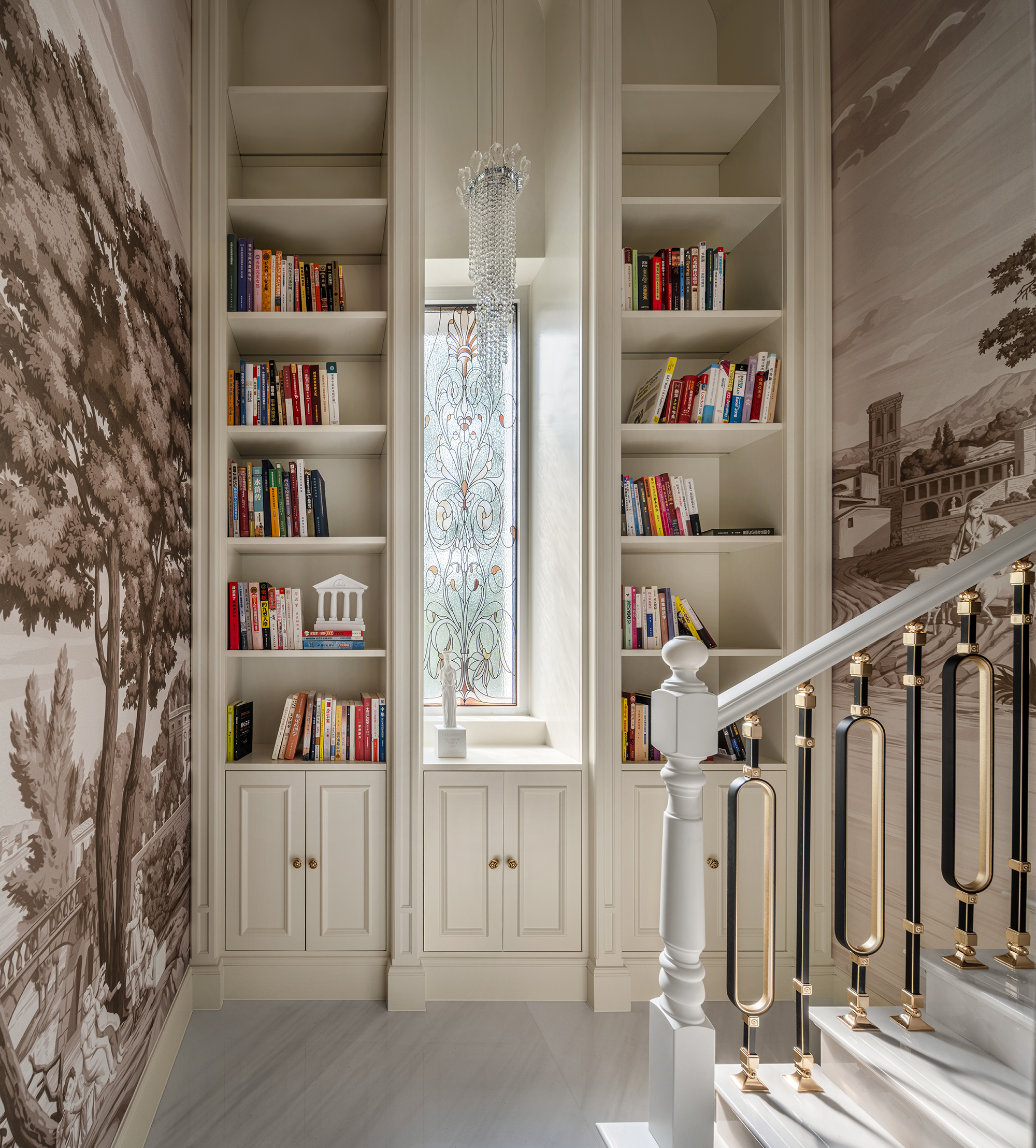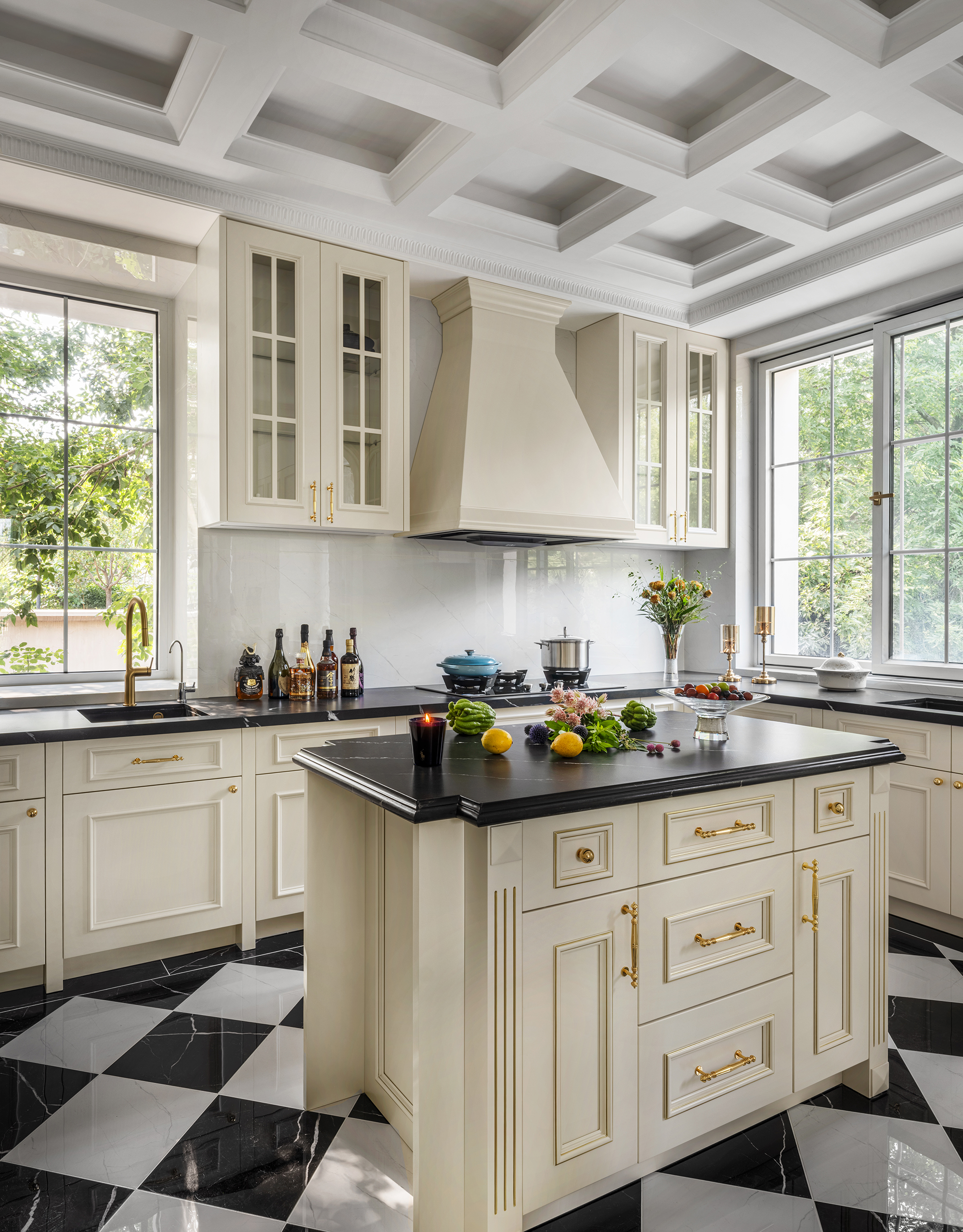 Elegant plaster mouldings outline the living room walls with restraint, while classical proportions reinforce architectural order without overwhelming the space. The result is an environment that feels open and airy, yet comfortably intimate. The adjoining open-plan Chinese and Western kitchen forms the heart of daily family life. Modern Western appliances are discreetly integrated within streamlined cabinetry, maintaining visual continuity with the living space. From morning coffee rituals to evening meal preparations and late-night conversations, the kitchen island naturally becomes a social focal point.