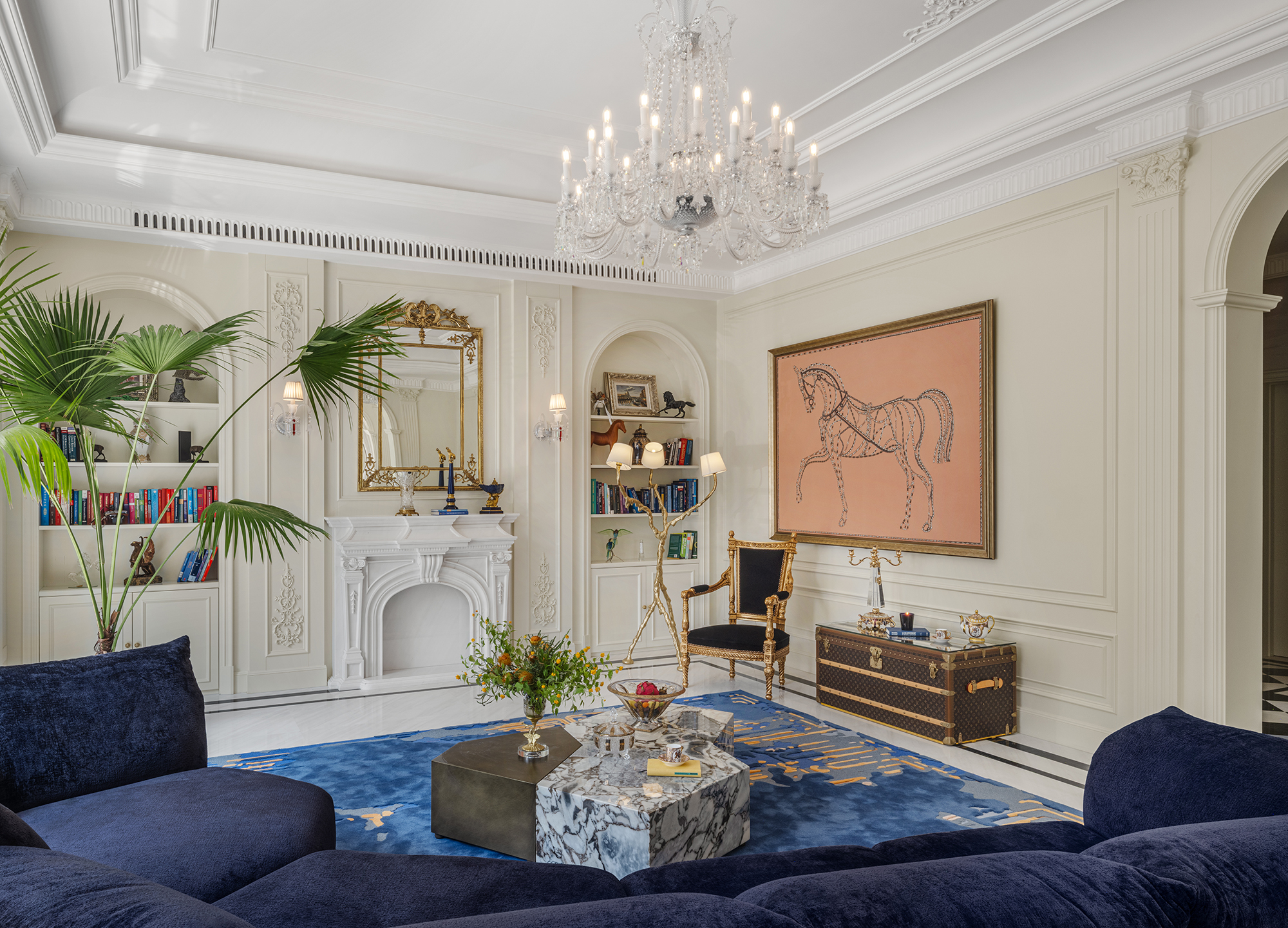 The double-height living room serves as a central gathering space, with a strong symmetrical axis lending rhythm and balance to the interior. A sapphire-blue velvet sofa anchors the room visually, complemented by an emerald green armchair that introduces a refined chromatic contrast. Sunlight filters through arched openings, gently illuminating the off-white walls and creating an inviting, tranquil setting for family interaction.
