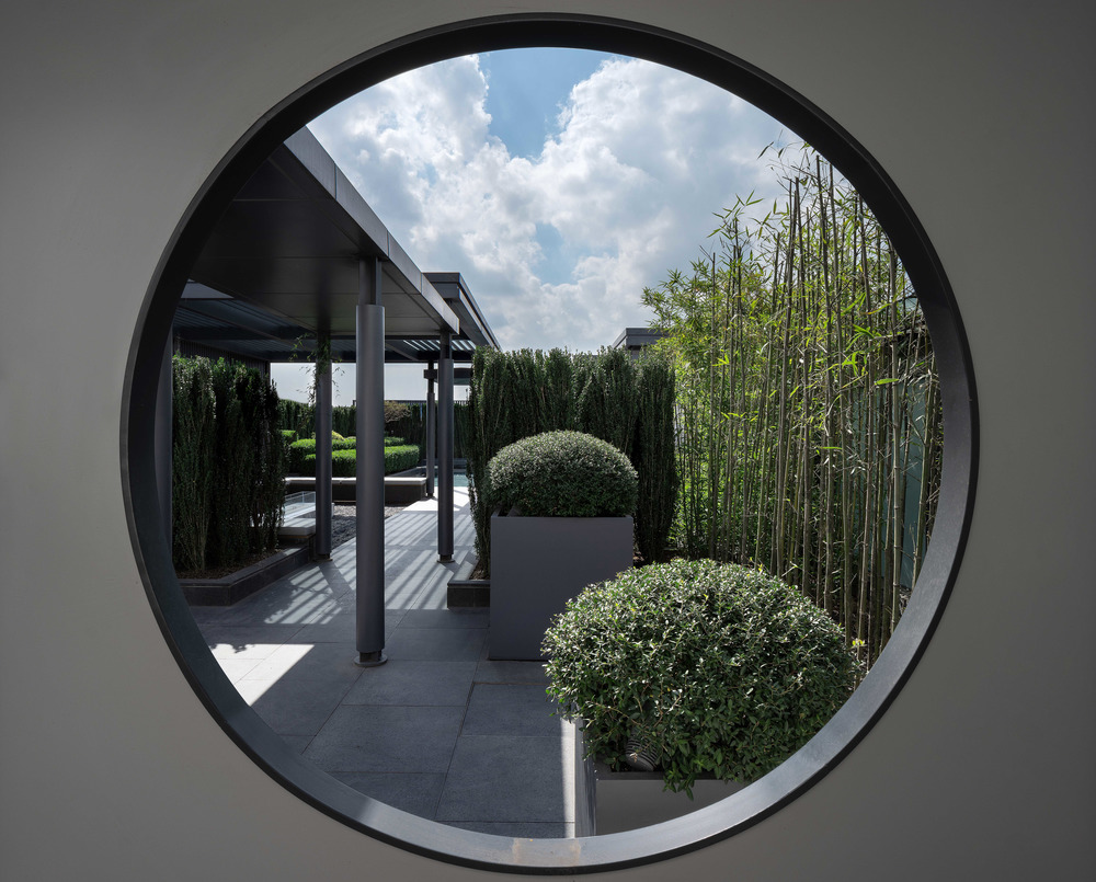 Oriental gardens combine bridges, ponds, and other elements to bring nature into the premise. Xiaoya uses the concept of oriental gardens to create a western landscape, denoted by geometric patterns, vegetation, architecture, and water features to instill a sense of harmony and calm. Within, mirrors and windows are strategically placed to give one a full, uninterrupted view of the outside.