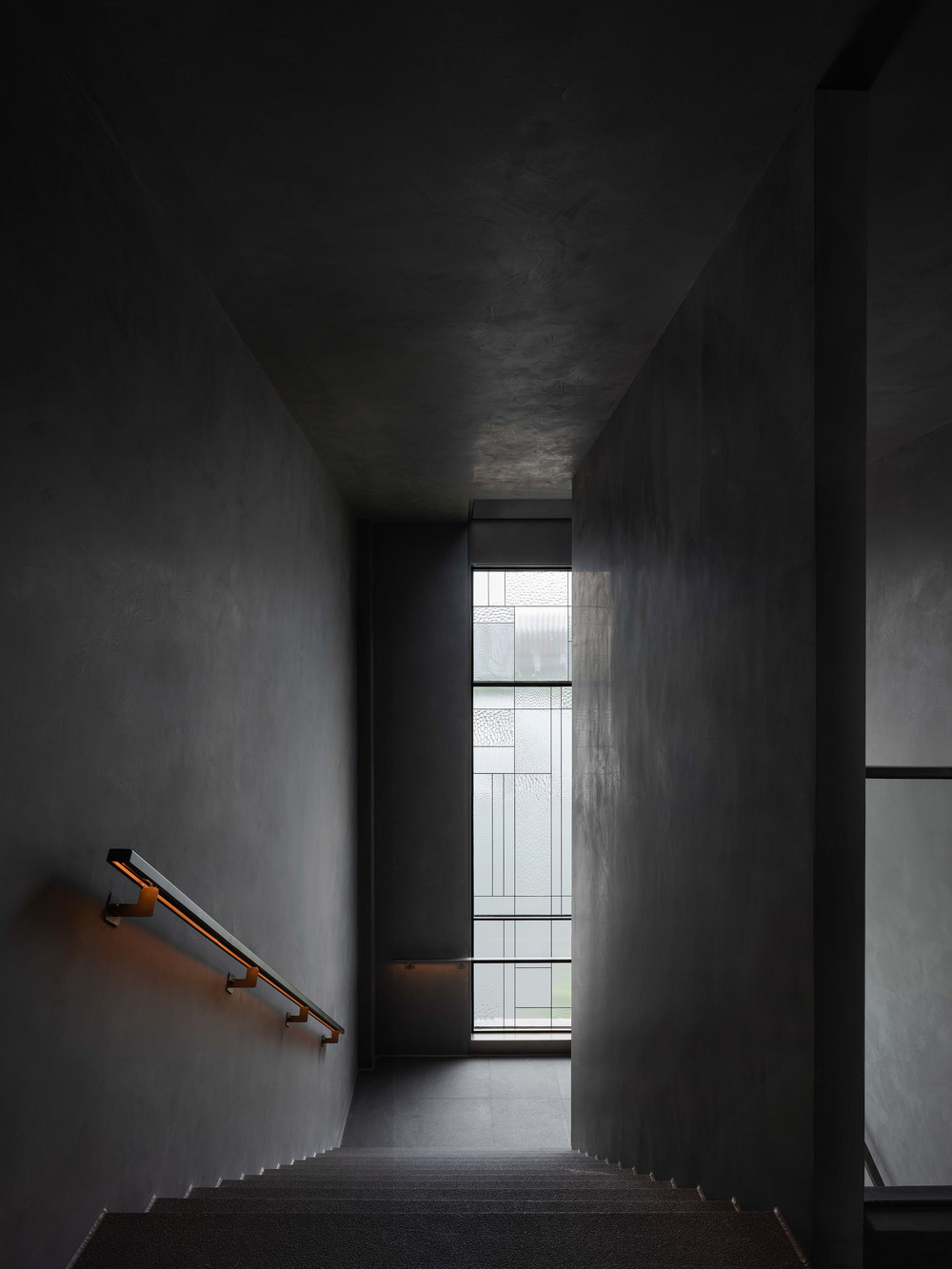 There are two water courtyards. The central one takes a view of the sky and the water as a mirror. The shadow is refracted indoor, into the dining hall and meeting room.