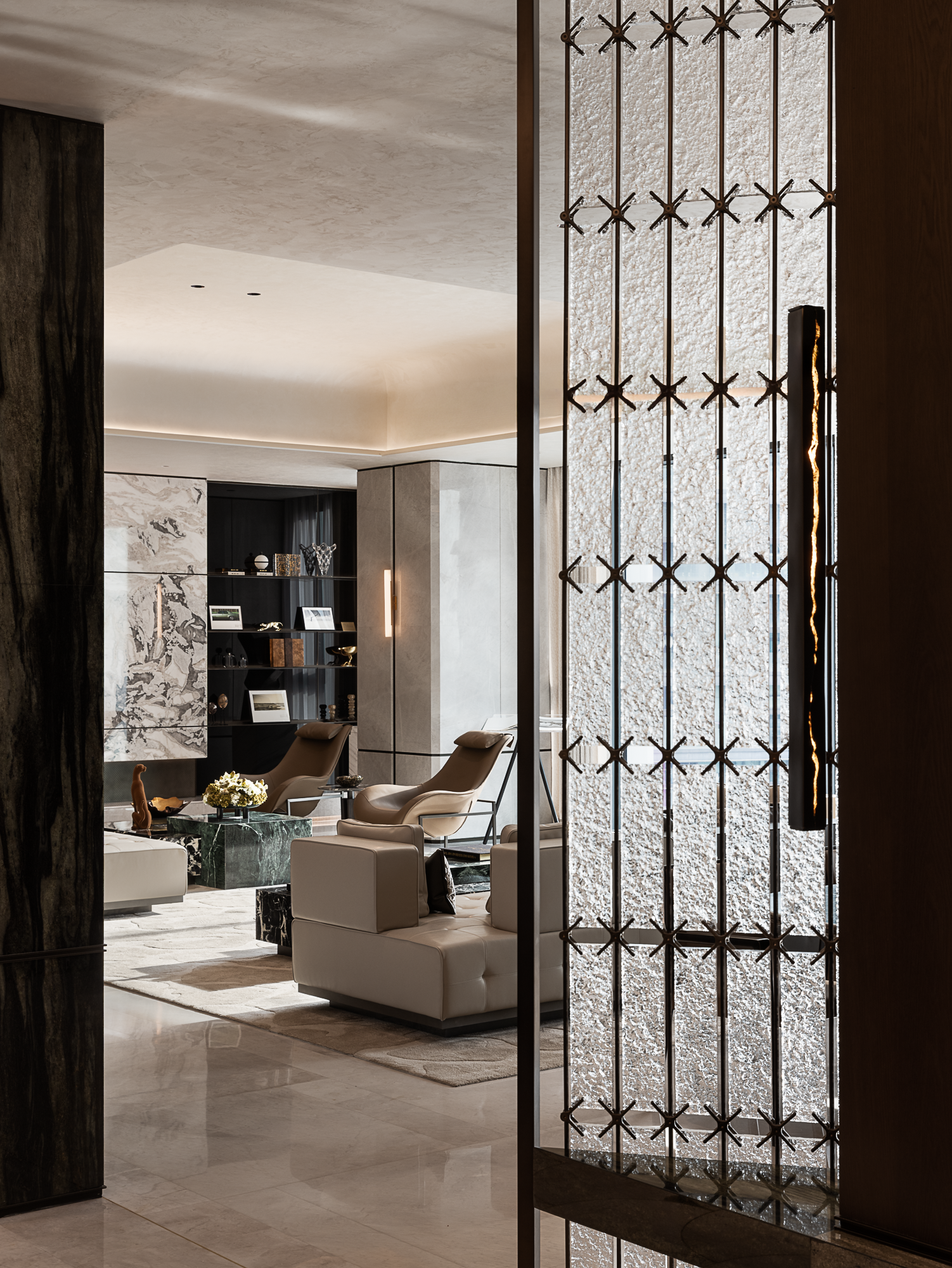 At the entrance, dark timber veneers meet textured metal accents. Here, fan-shaped stone flooring, edged with fine metal inlays, reflects light softly. Textured glass framed by a matte metal grille strikes a subtle balance between openness and obscurity. The living and dining area, anchoring the spatial axis, becomes the multifunctional heart of the home. Floor-to-ceiling windows draw in the Qiantang River skyline, infusing the interior with a rhythmic sense of breath and openness.