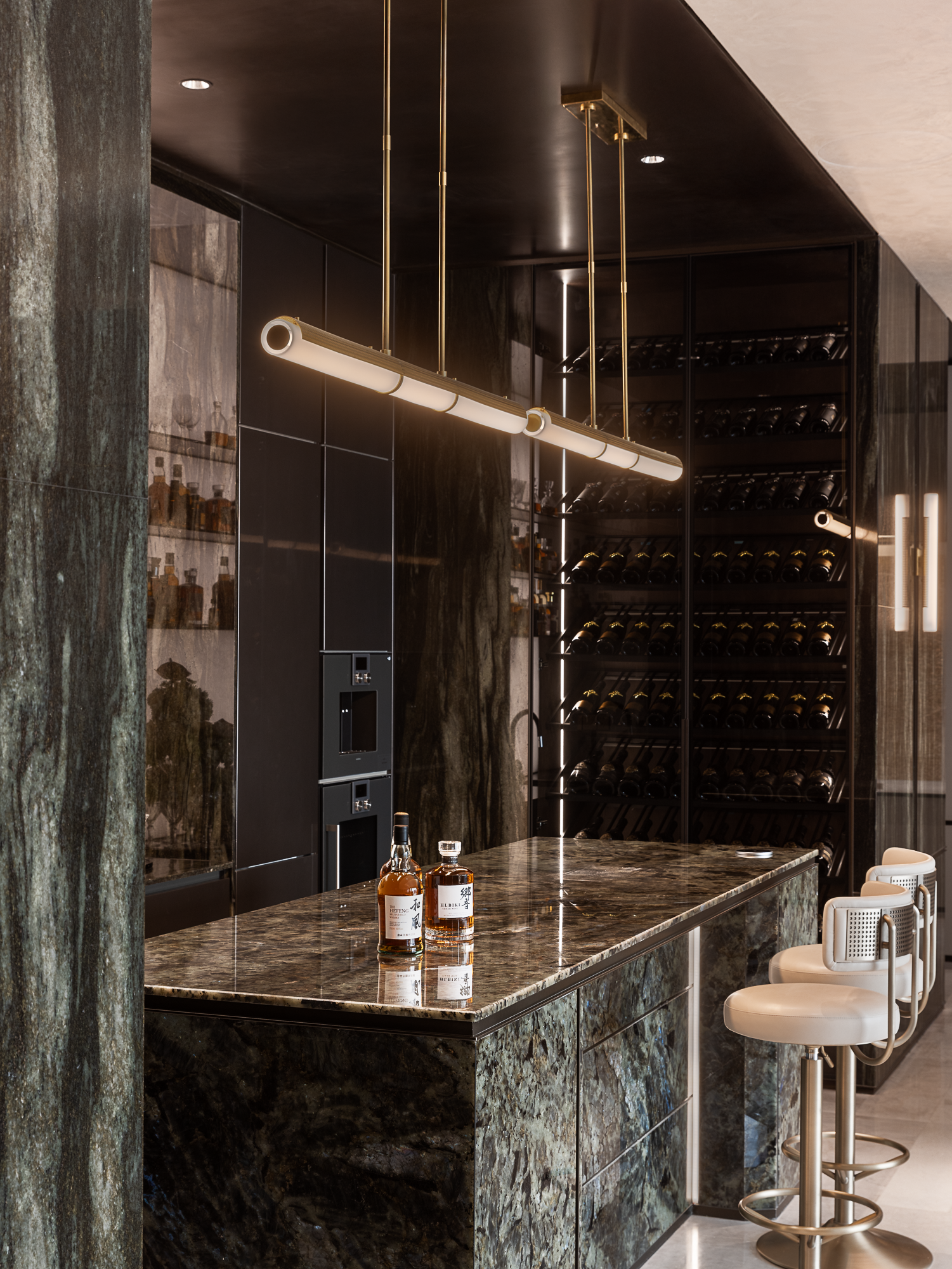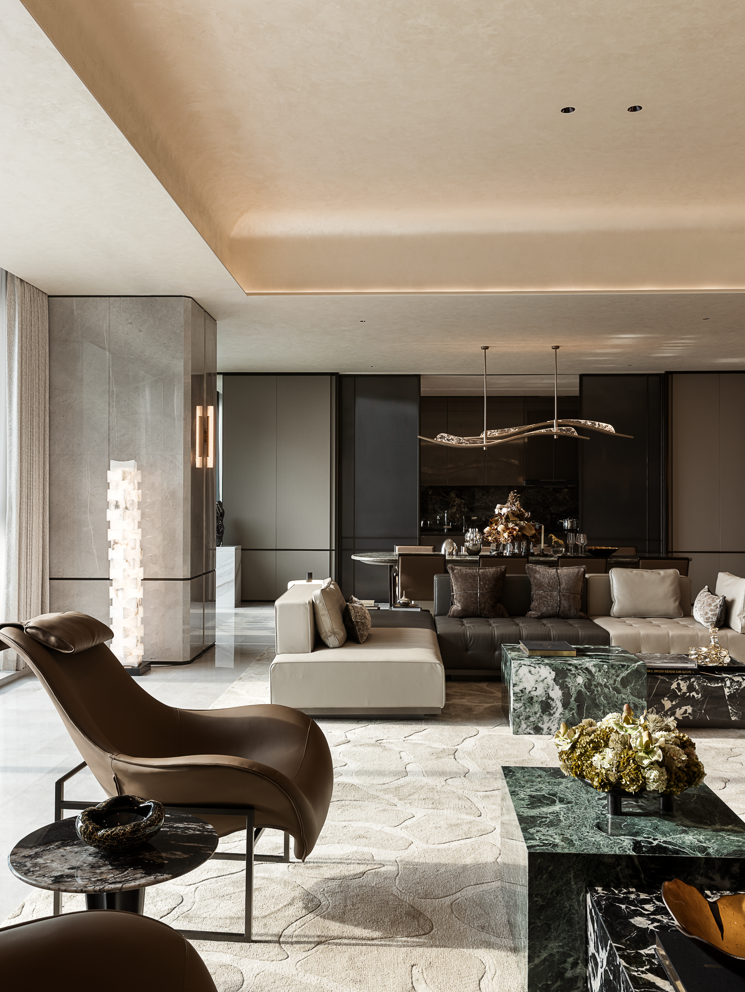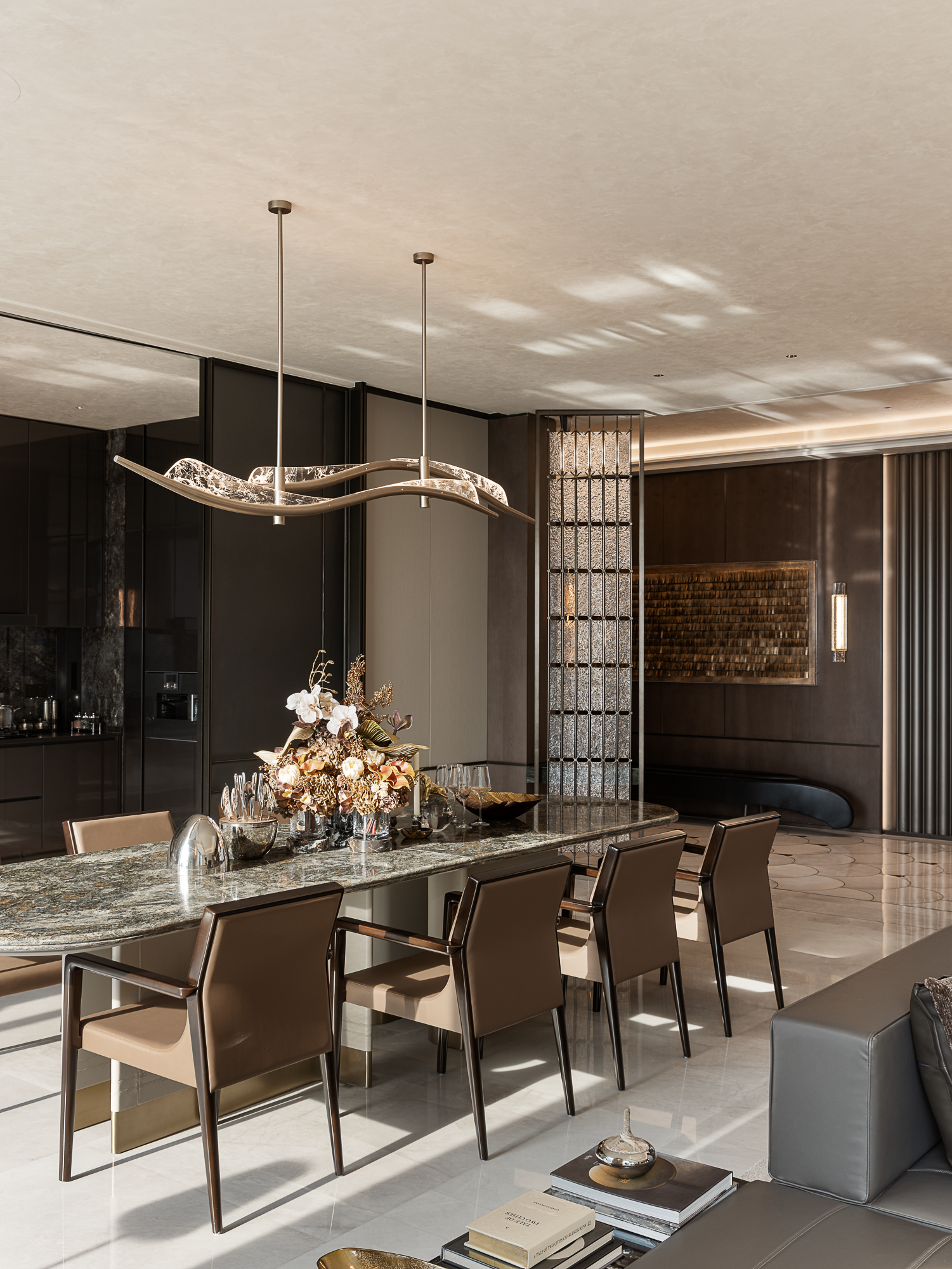 In the living room, a palette of warm greige sets a calm tone. The marble TV wall, like a frozen landscape, becomes a visual focal point. Curated lighting—alternating between directional focus and gentle diffusion—creates a nuanced atmosphere that shifts throughout the day. Low-slung, relaxed sofas define an area for interaction, while the green-veined stone coffee tables and beige carpet strike a tactile balance of warmth and restraint. A long dining table, defined by its dark, textured stone surface, mirrors the undulating lamps above. Light dances between metal and stone surfaces, composing a gentle, fluid rhythm.
