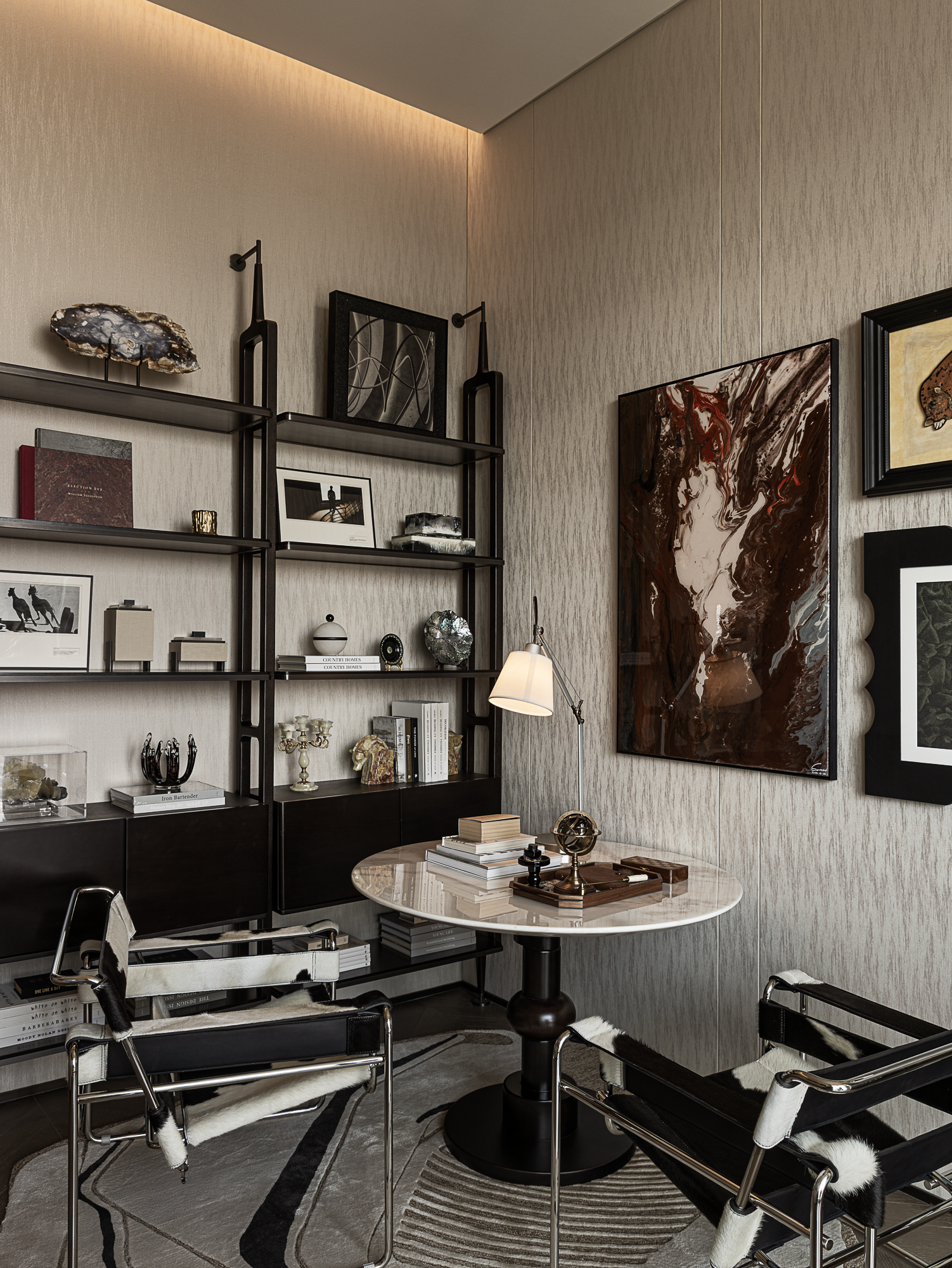 An open-concept kitchen extends the flow of the dining and living area, seamlessly defined without boundaries. A deep-green stone island anchors the space as a social hub. A geometric pendant light casts soft reflections across the intricate stone surface, its glow mingling with the wine cabinet and glassware—evoking a quiet sense of ritual in everyday life. Behind the sliding door, an Chinese kitchen adopts a more restrained layout. Built-in storage and counters streamline circulation into an efficient loop. The frosted glass partition blocks cooking fumes while preserving a subtle spatial dialogue. Tucked away from the main circulation, the study exudes quiet composure. Textured beige walls shimmer gently under shifting light, playing against dark timber shelves. A circular stone table and two leather-and-metal chairs create a contemplative setting.