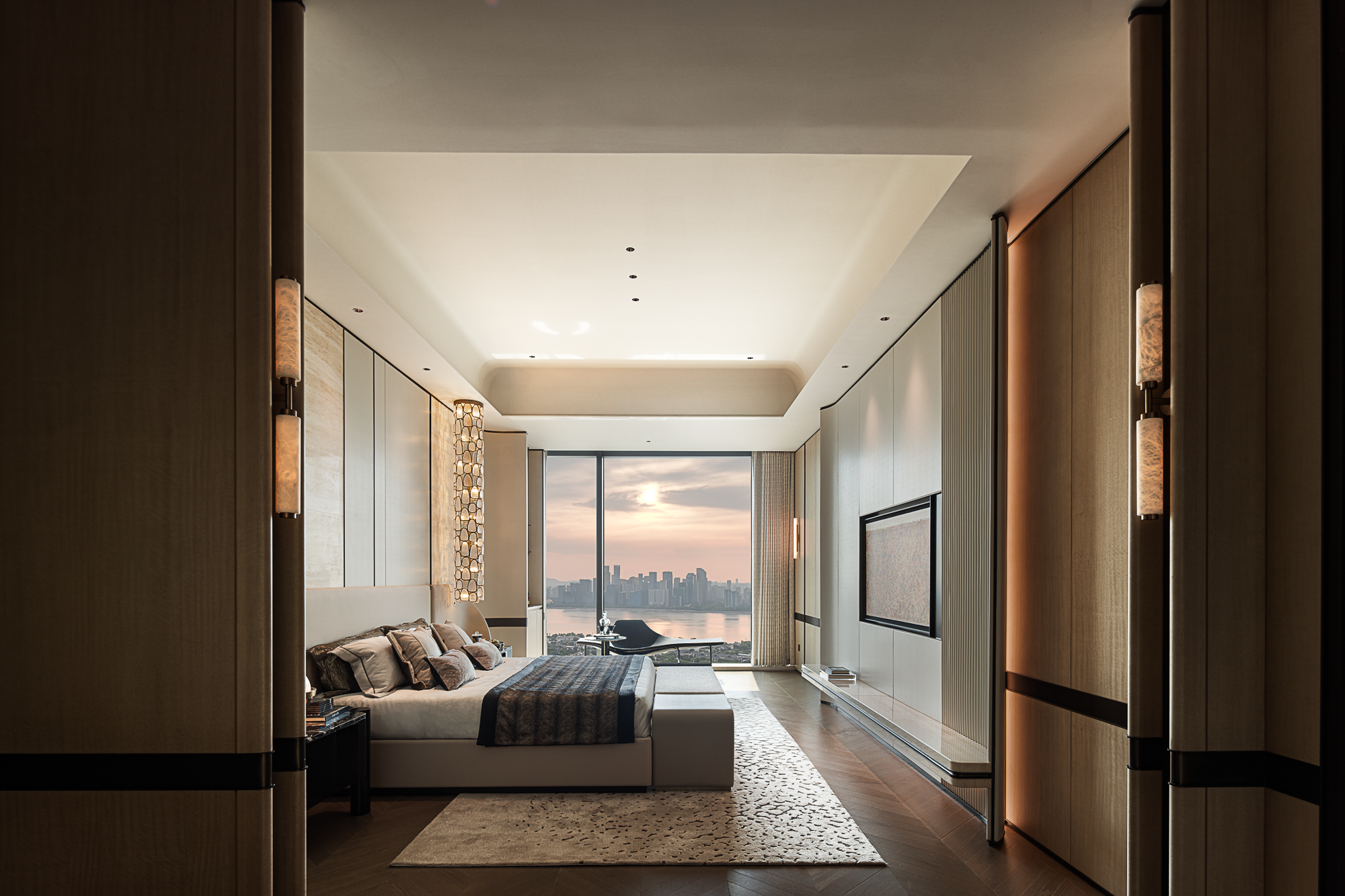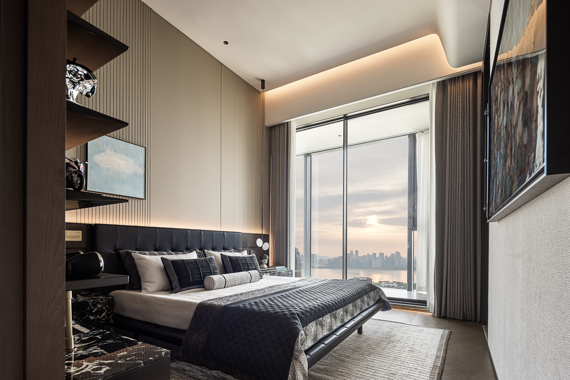 The south bedroom, in contrast, feels more restrained and serene. Vertical textures in warm taupe and beige bring quiet depth. A dark leather headboard, complemented by a horizontal light strip, creates a quiet visual focal point. A floor-to-ceiling window frames the river view beyond, balancing intimacy with openness. Here, beauty lies not in complexity but in the quiet convergence of space, light, and material—serene and composed.