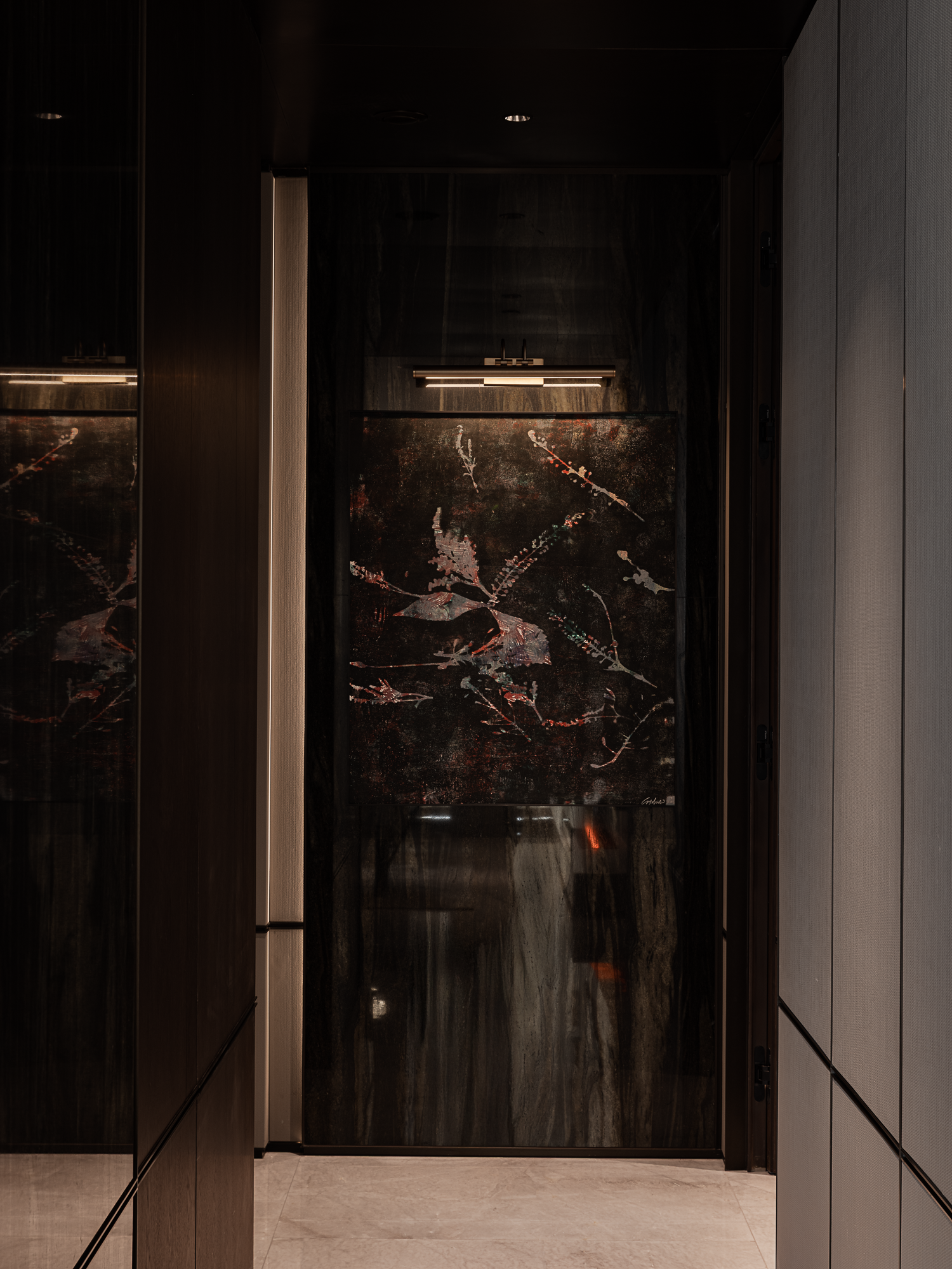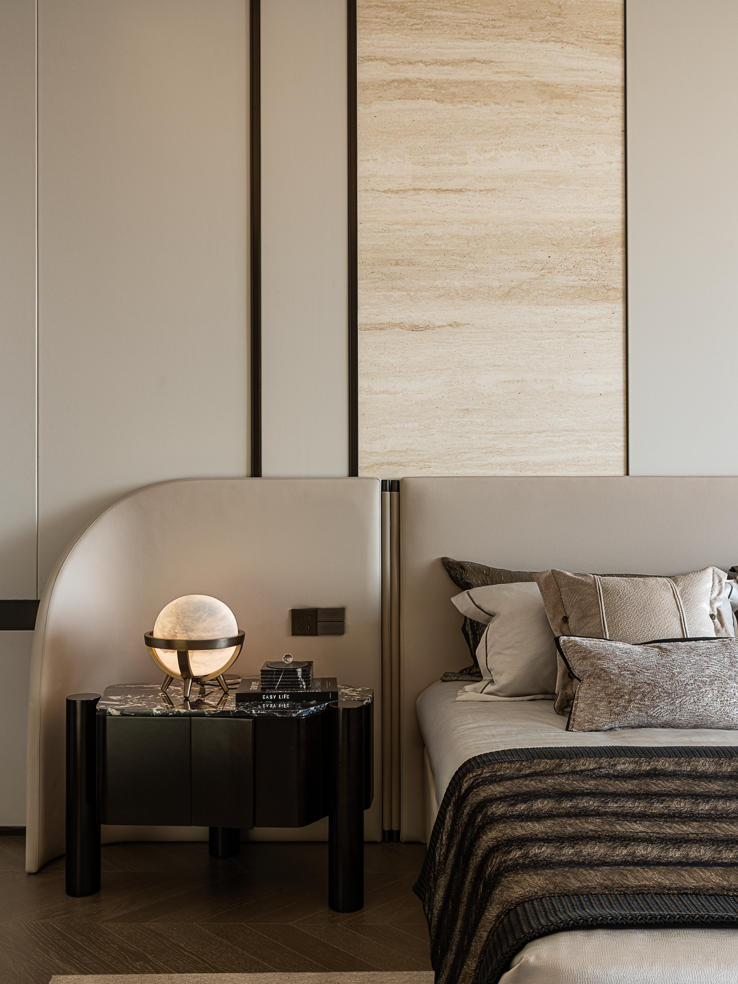 Stepping from the corridor into the private area, wood veneers alternate with warm grey stone cladding, accented by wall lamps and artworks—a subdued prelude leading into the master suite. A soft grey curved wall embraces the space, with horizontally grained stone inlays extending the spatial rhythm. A beige leather bed paired with an enveloping headboard offers both tactile comfort and visual warmth. Concealed lighting softens the recessed ceiling, lending the structure a sense of lightness. Light awakens the texture of each material—restrained, serene, yet quietly expressive.