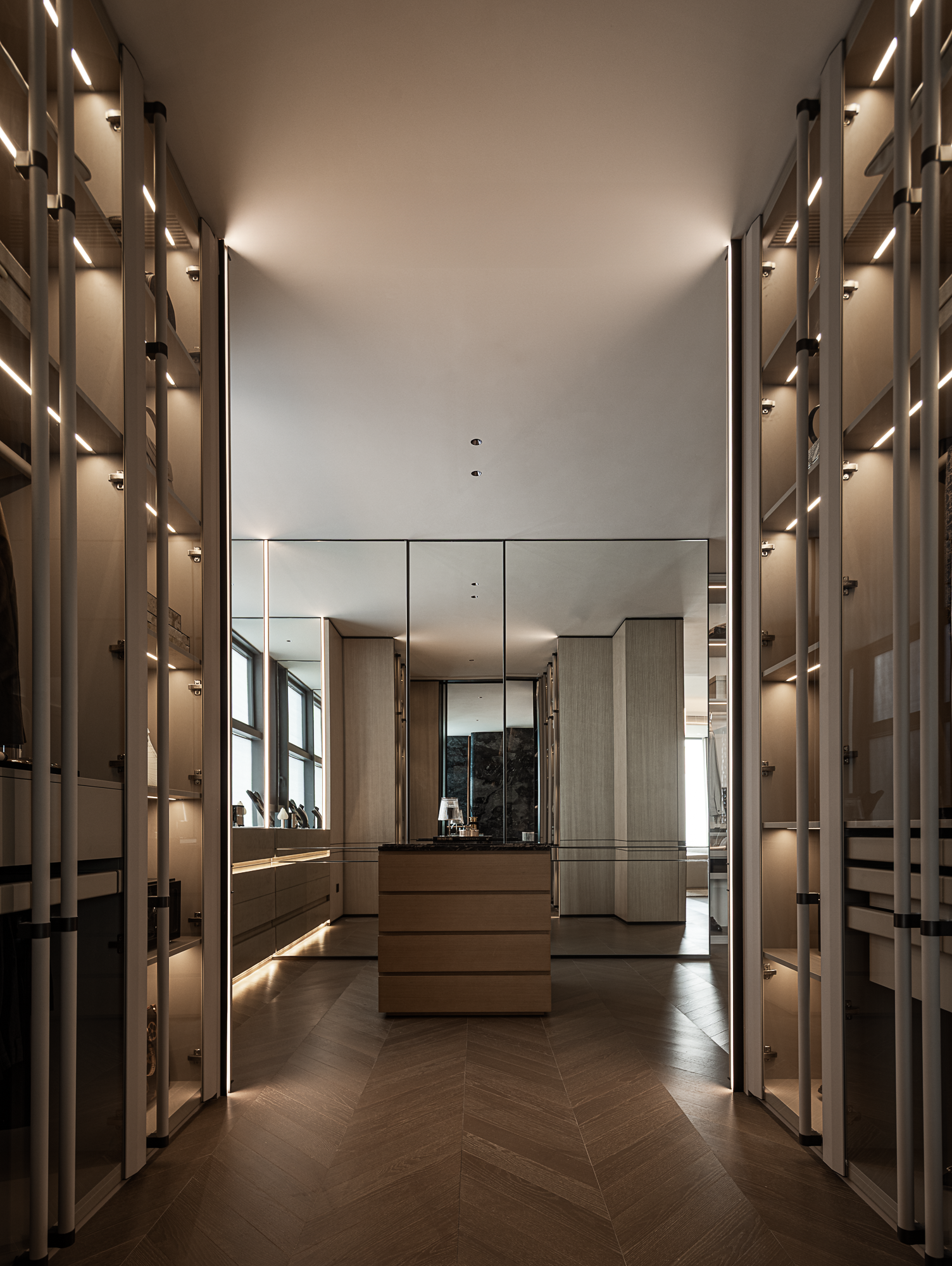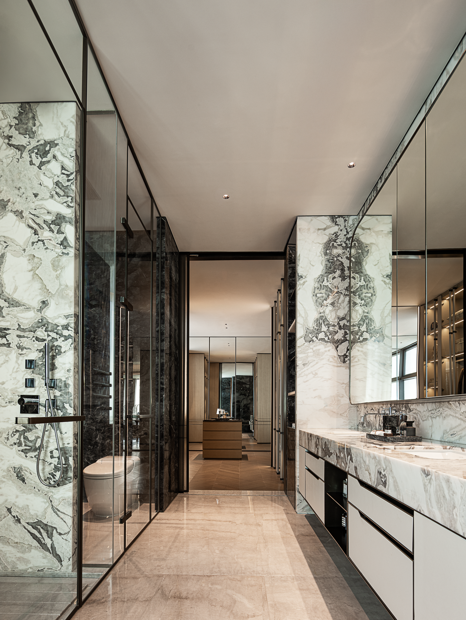 Full-height wardrobes in pale wood and glass define the walk-in closet, where a central island enhances fluid movement. A mirrored wall visually extends the spatial depth, drawing in natural light from the side window. The spatial configuration enables a soft, seamless circulation between bedroom and bathroom. In the bathroom, grey-white veined stone evokes ink-wash paintings—subtle yet expressive. A floating vanity lends a sense of lightness, while transparent glass delineates each function with clarity. A freestanding bathtub nestles quietly by the window, with a discreet side door creating a soft boundary for solitude.