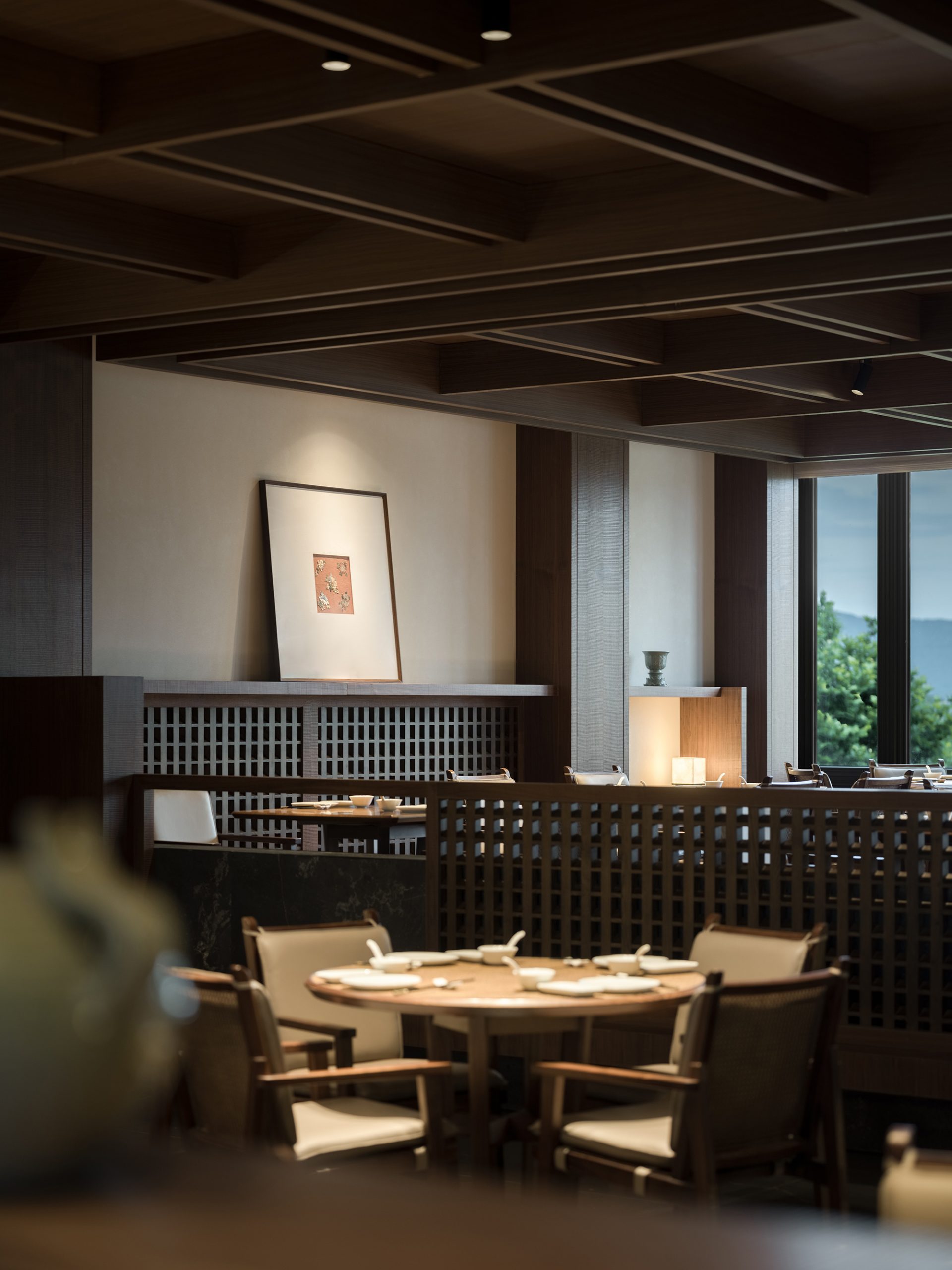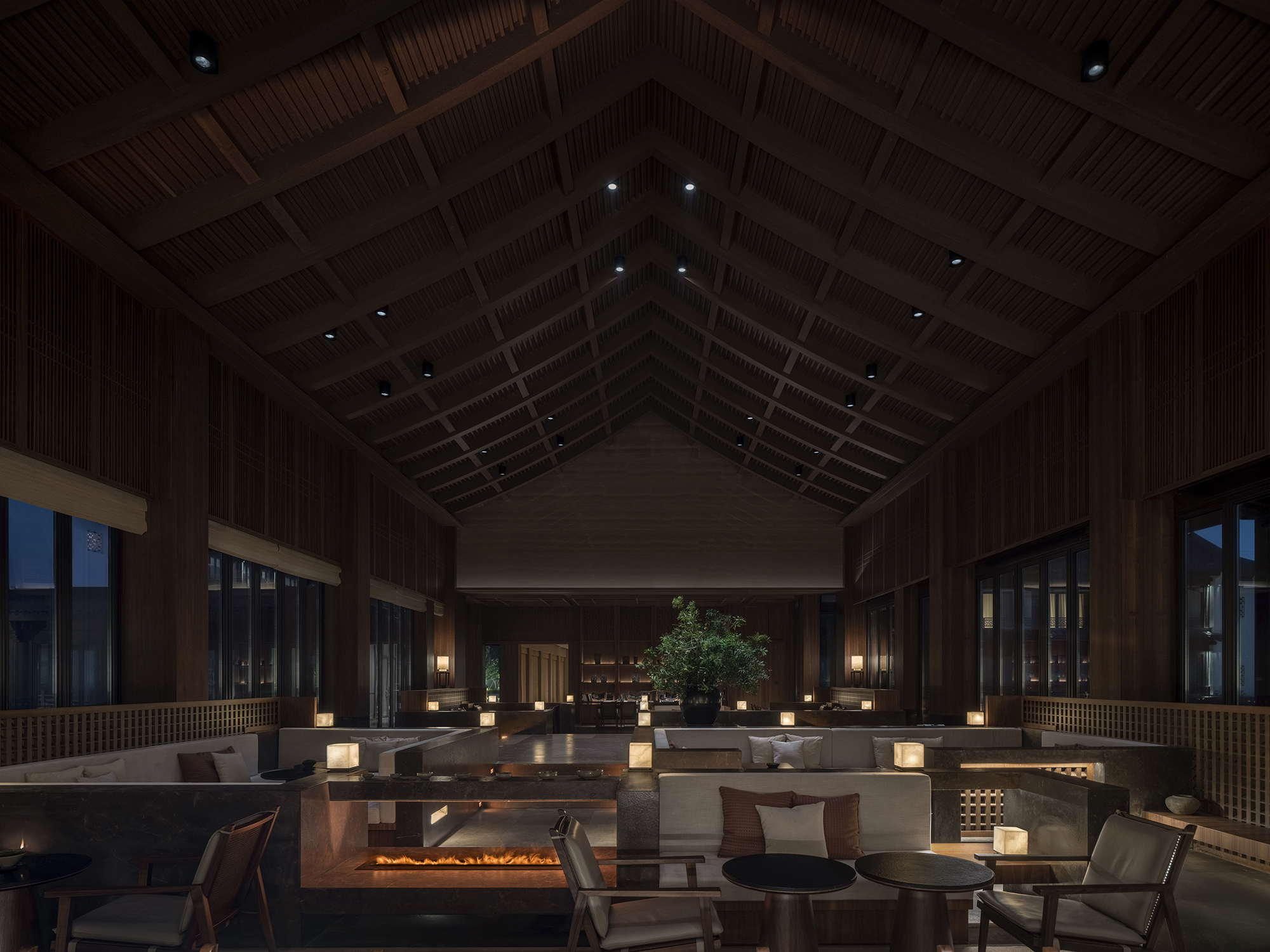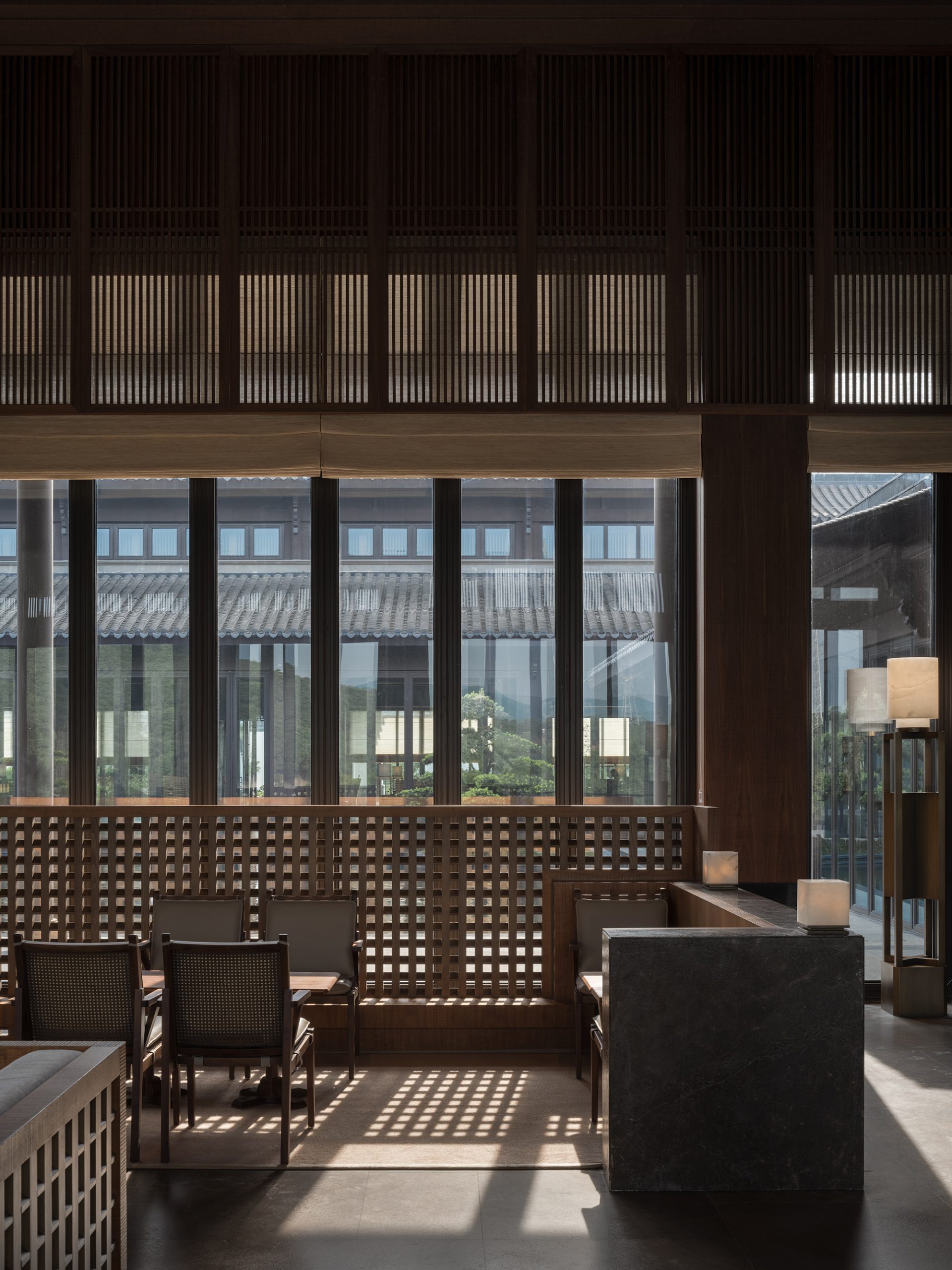 The public areas, particularly the hotel lobby, draw inspiration from the symmetry of classical Chinese garden courtyards. Facing the tranquil lake, the lobby bar is framed by a soaring atrium, amplifying a sense of openness and dramatic tension that aligns with architectural facades.