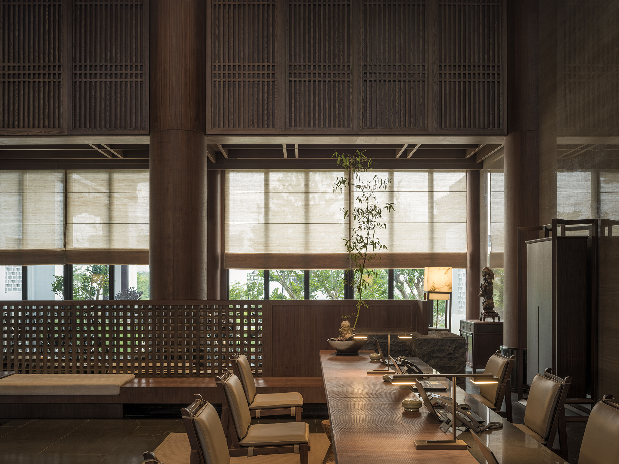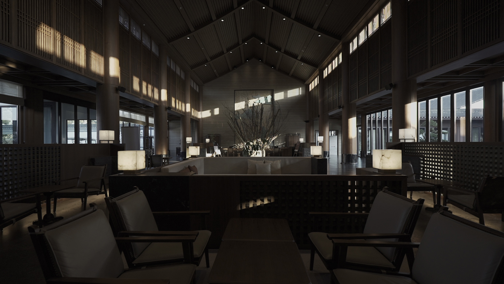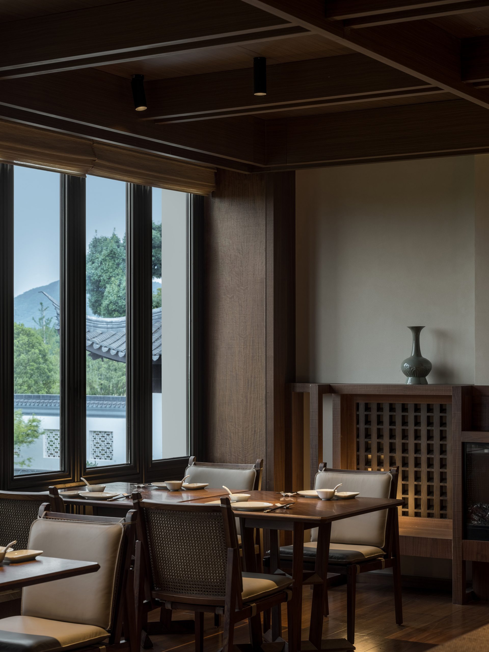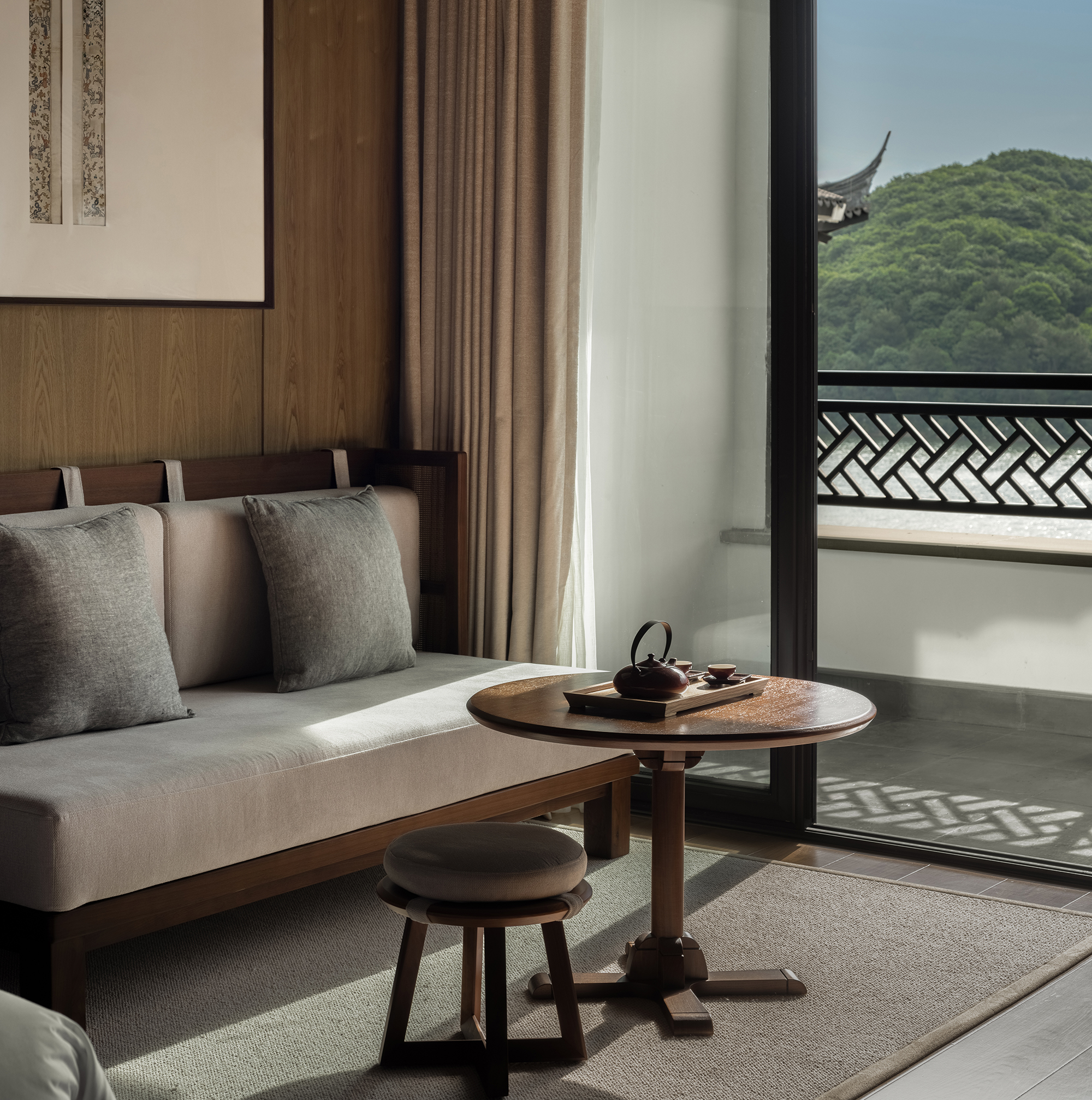 The public areas, particularly the hotel lobby, draw inspiration from the symmetry of classical Chinese garden courtyards. Facing the tranquil lake, the lobby bar is framed by a soaring atrium, amplifying a sense of openness and dramatic tension that aligns with architectural facades.