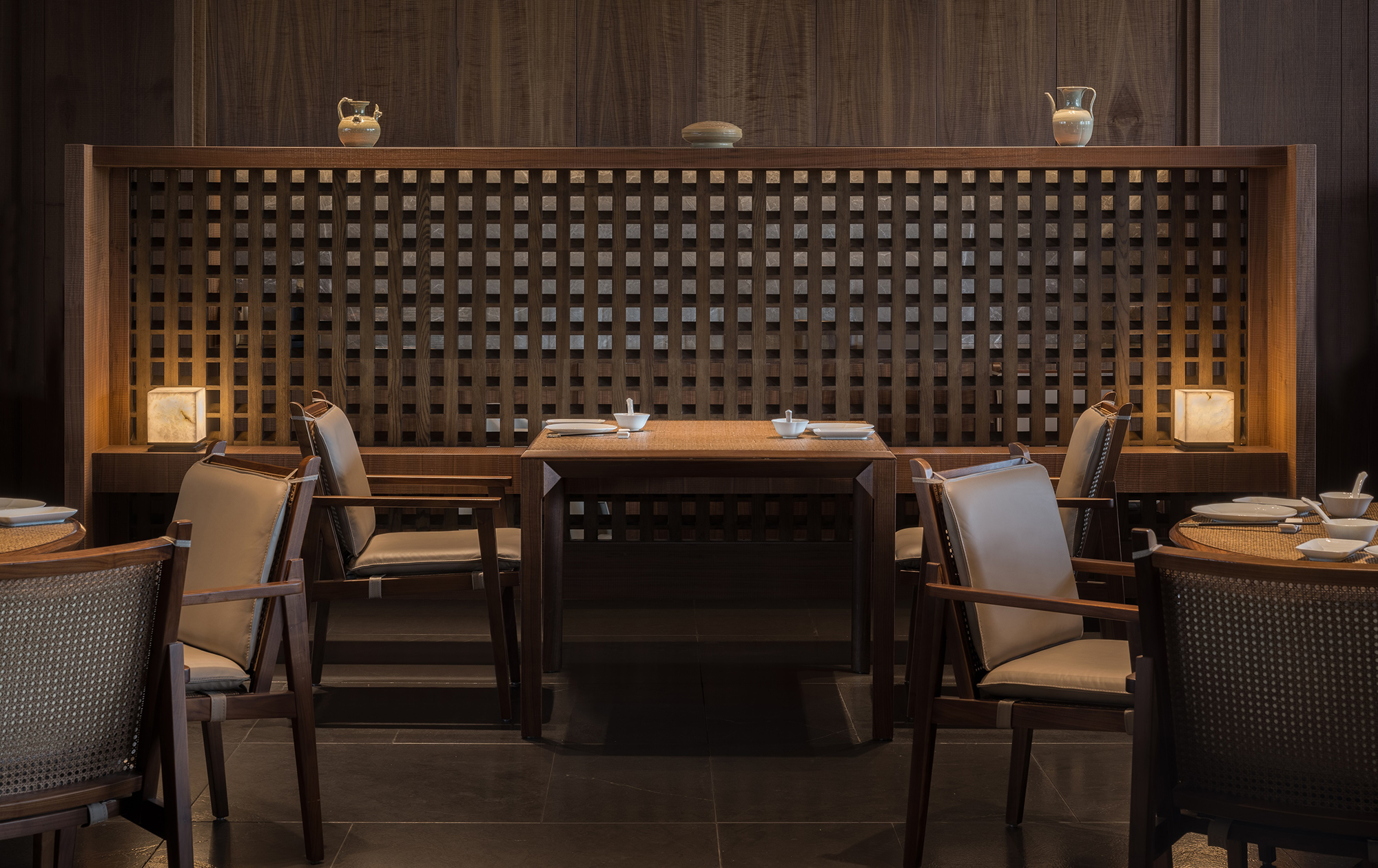The Chinese restaurant employs translucent and partially see-through elements to evoke a sense of fluidity and spatial layering, reminiscent of a meandering garden with winding paths and unfolding vistas.