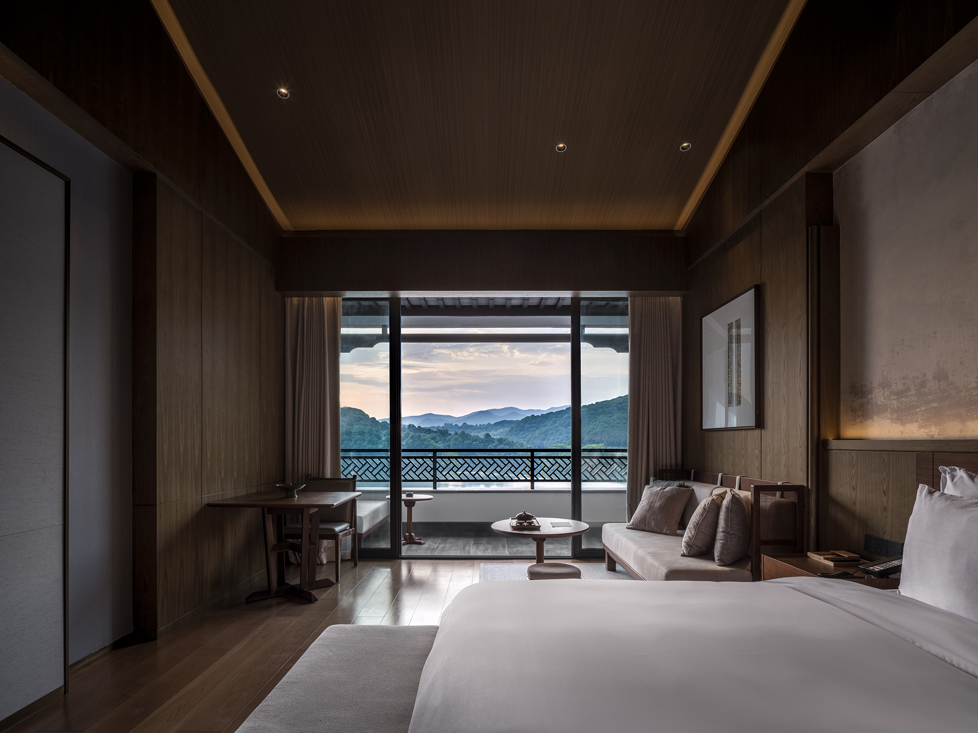 The guest rooms, facing the lake, continue the simplicity of the public areas. Embroidered wall paintings inspired by ancient local official attire imbue the space with an understated artistic charm. Elegant wooden accents echo the natural poetry of Dongshan, creating a sanctuary of tranquil leisure amidst the mountain landscape.
