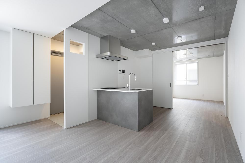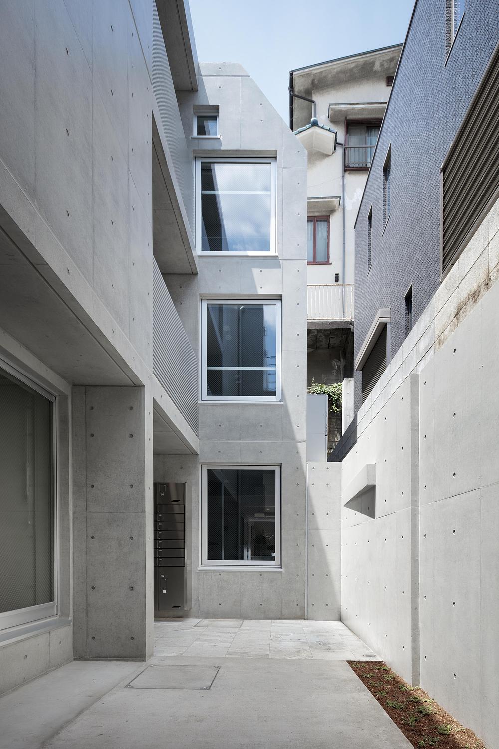 Behind the site lies a ten-metre-high cliff with no openings, ensuring structural stability, while the street-facing elevation opens generously with a rhythmic grid of square apertures connecting the interior life to the city. Each unit features openings on two sides to optimise natural ventilation and illumination, minimising dependence on mechanical systems. Residents enjoy framed views of the lush greenery atop the hill—an architectural reinterpretation of shakkei, the traditional Japanese concept of borrowed landscape.