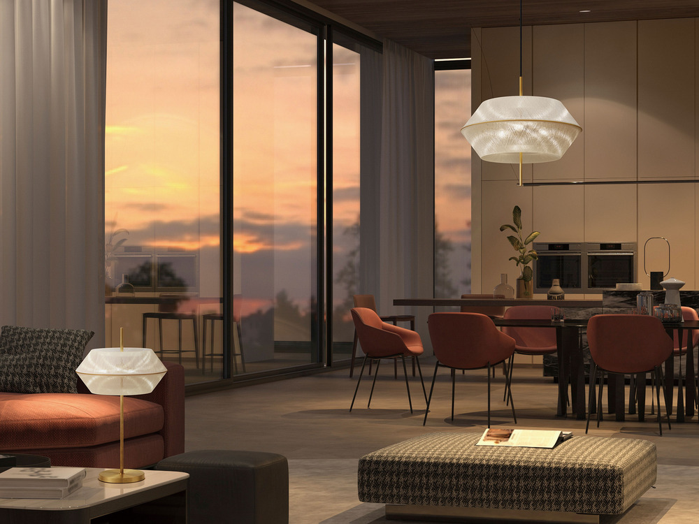At the centre, a silhouette inspired by the horizon line emerges — an artistic expression of the tranquil moments of twilight. Acrylic diffusers at the top and bottom soften the glow, producing an ambient illumination that gently fills the space. The result is a lighting piece that captures both radiance and warmth, evoking the quiet beauty of the evening sky. Available in pendant lamps (in two sizes), and a table lamp variation, Twilight brings a cohesive sense of atmosphere to interiors — whether as a refined accent for the home, or as a luminous focal point in lounges and hotel lobbies.